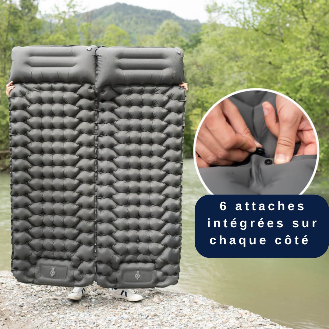 Grâce à 6 boutons-pression intégrés de chaque côté, vous pouvez connecter facilement et solidement plusieurs matelas – idéal pour le camping, les sorties ou simplement pour se détendre.
